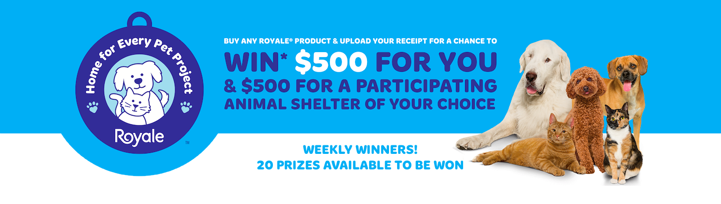 Look for their pets on our special 2022 Royale® Home for Every Pet Project packaging wherever you buy your Royale® paper products.